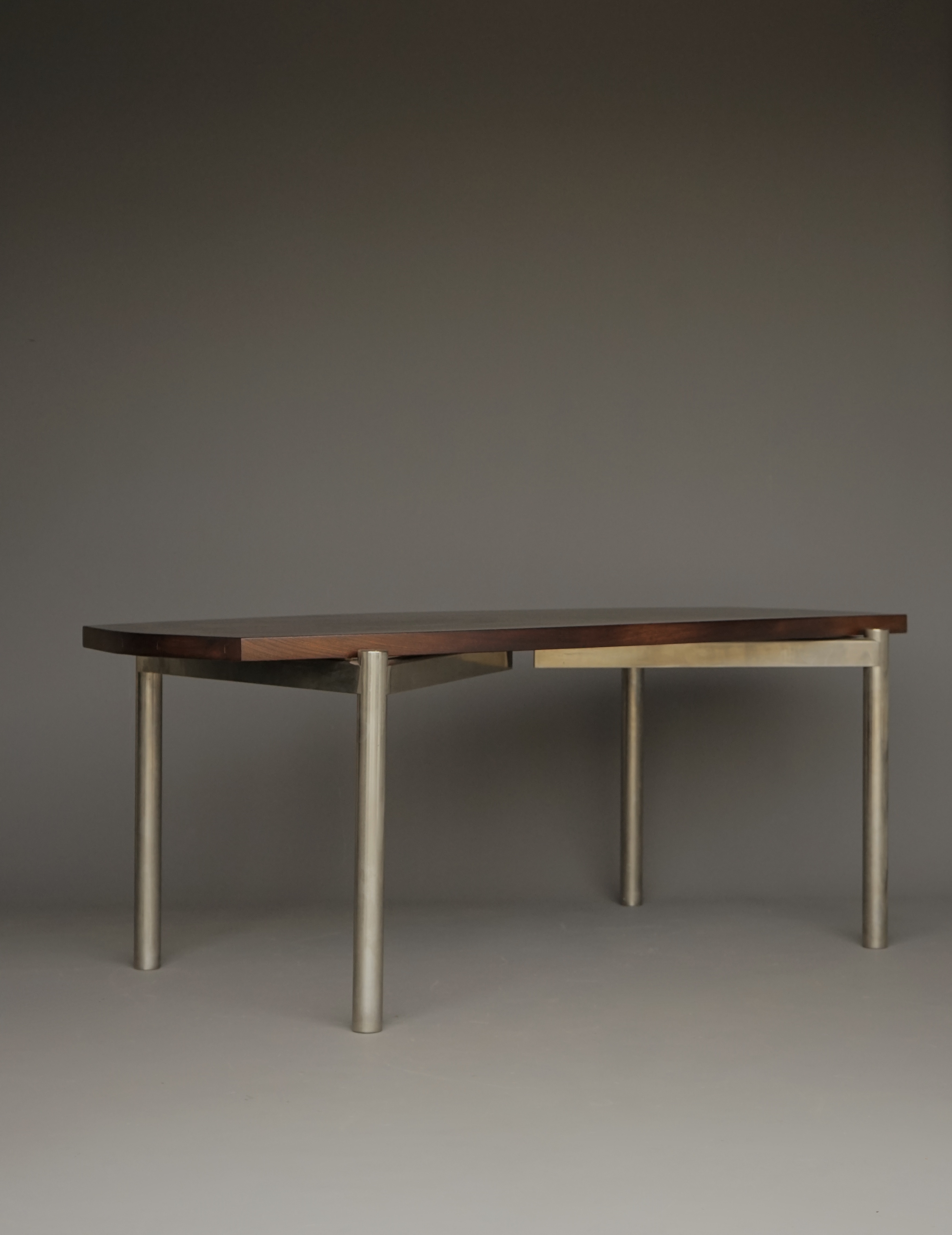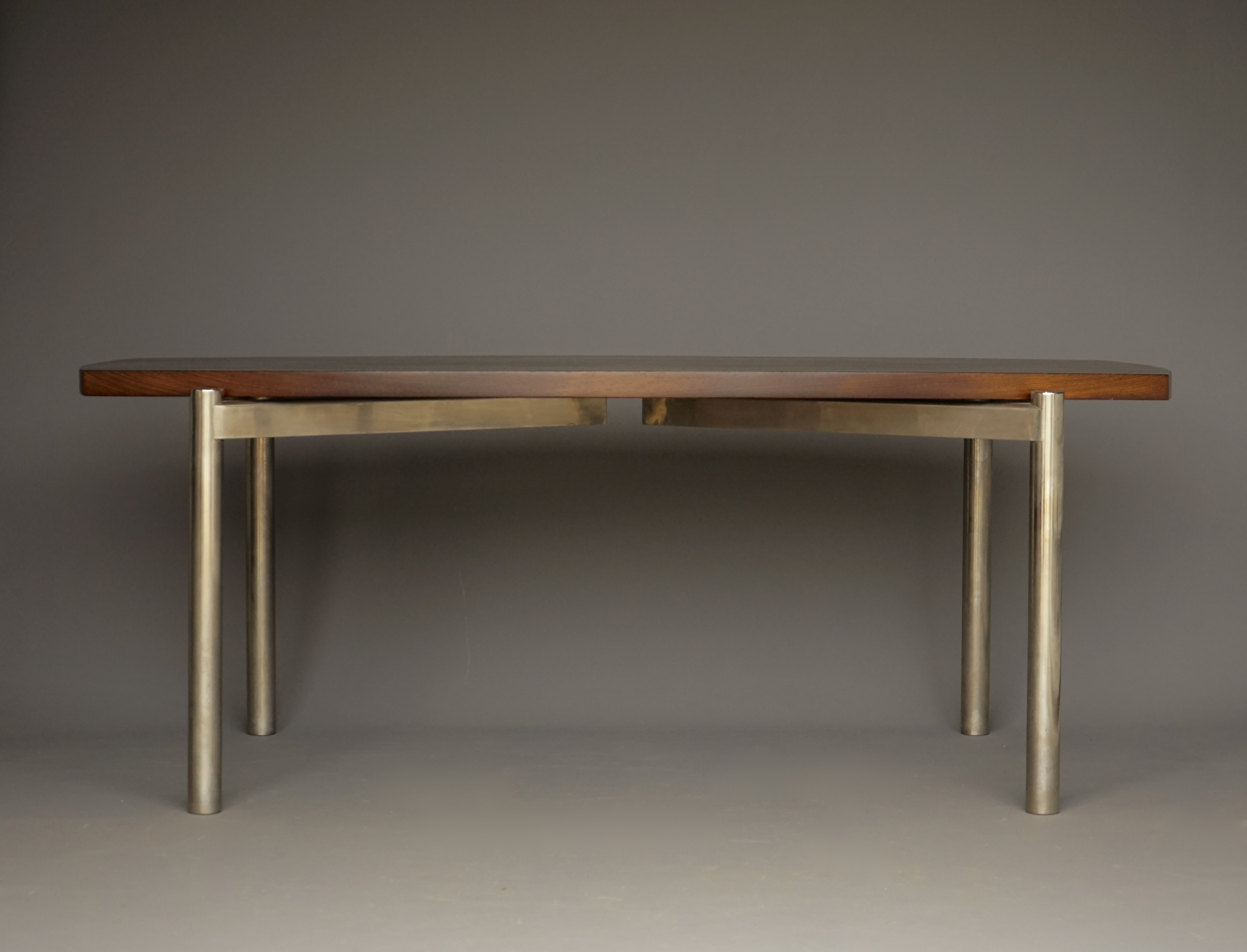 It has a handmade chromed metal base in two triangular sections, and a 4.5 cm thick solid wenge wood top with curved sides that gives this table both a strict modern presence and a considered elegance and warmth.
