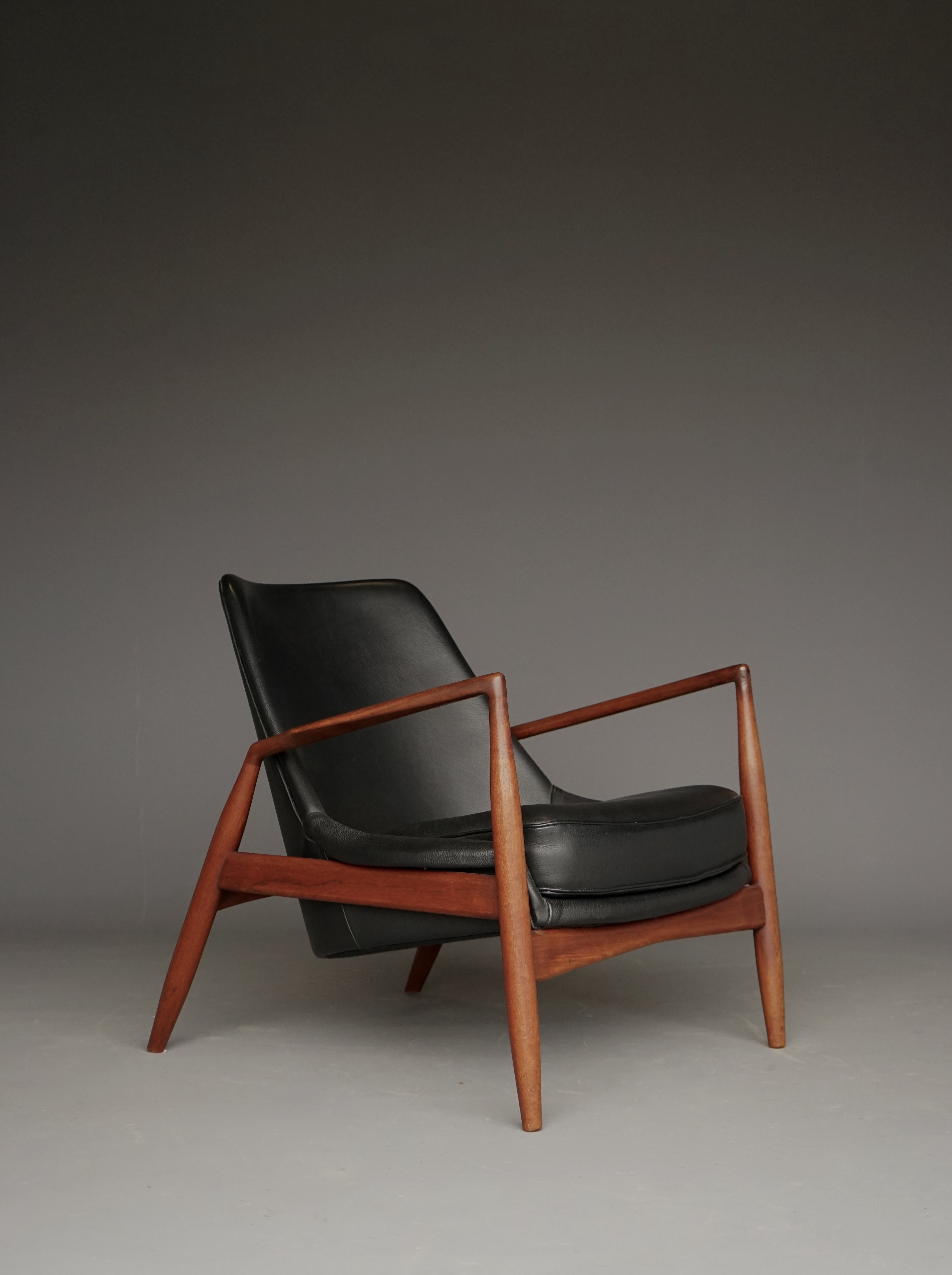 A classic ‘Seal’ chair in leather and teak by Koford-Larsen who was one of the top midcentury Scandinavian architects during the era. This one is in absolute top condition. The original design is from the 1950s. This chair is a 1960s production that was reupholstered in Sweden around the 1990s.