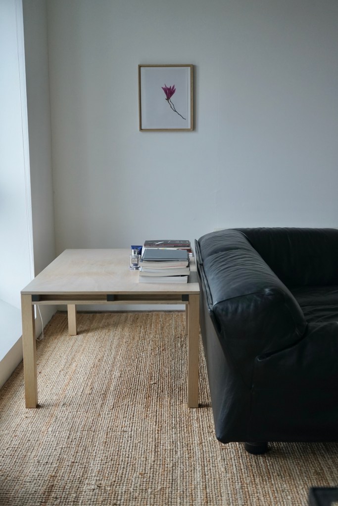 A very modestly designed constructivist table whose size measures somewhere between a dining table and a coffee table. It is particularly useful as a table at the back of a sofa as shown. The design of the table is reminiscent of the earlier modernist designs by Gerrit Rietveld/ Vilmos Huszár and the De Stijl movement. (We have images available of its ingenious construction).