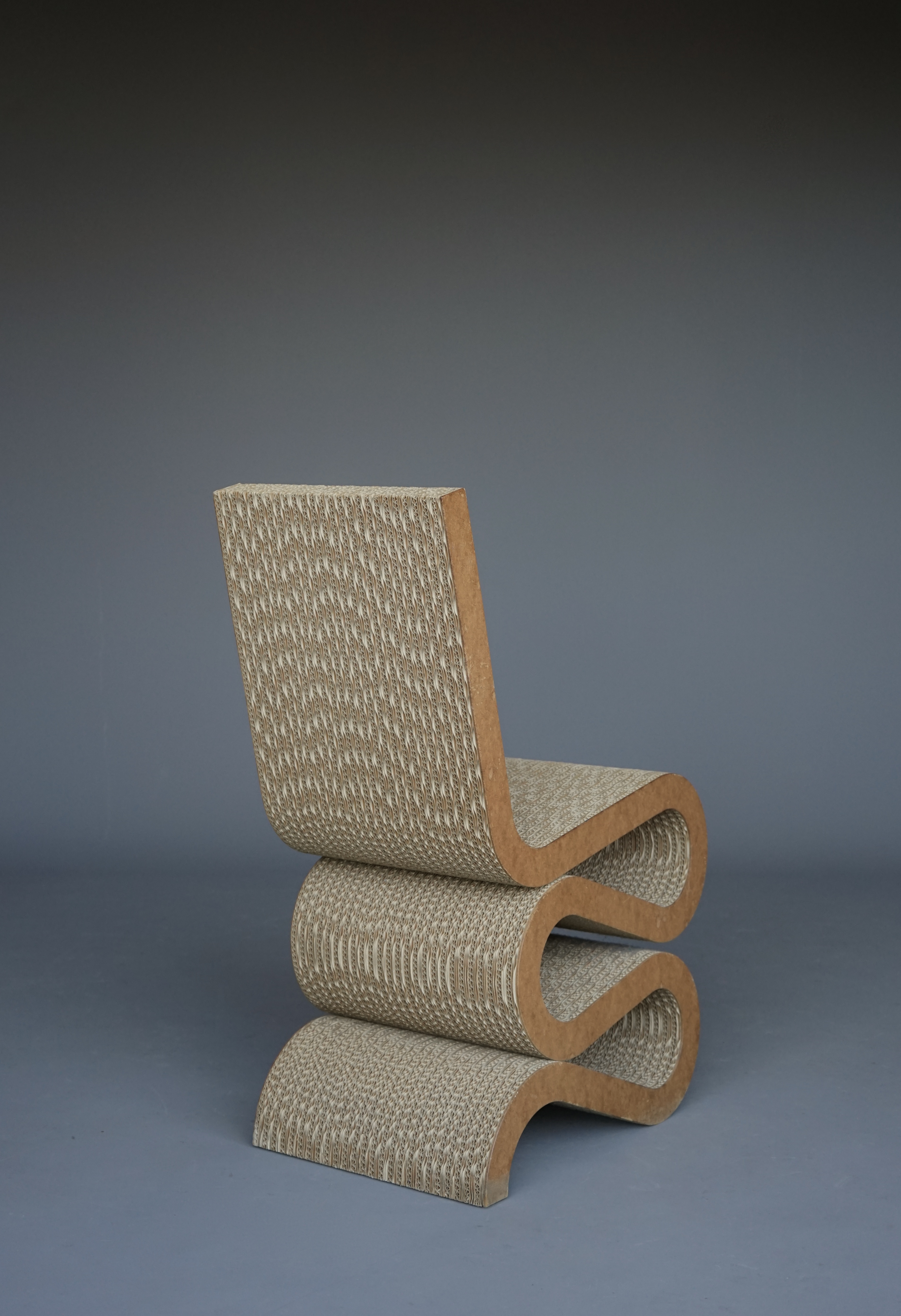 The chair was designed in 1972 as part of Gehry’s famous Easy Edges series. It was reissued by Vitra from 1992 as the Wiggle side chair. Created by the renowned architect Frank Gehry this extraordinary chair challenges the conventional notions of form, material and structural dynamic. Crafted from layers of corrugated cardboard, the Wiggle Chair exhibits a delicate balance between strength and flexibility. Gehry’s signature aesthetic make it a standout piece in any space. The chair has a slight twist/lean from use but it has a good warm tone (…that recent production chairs do not have)