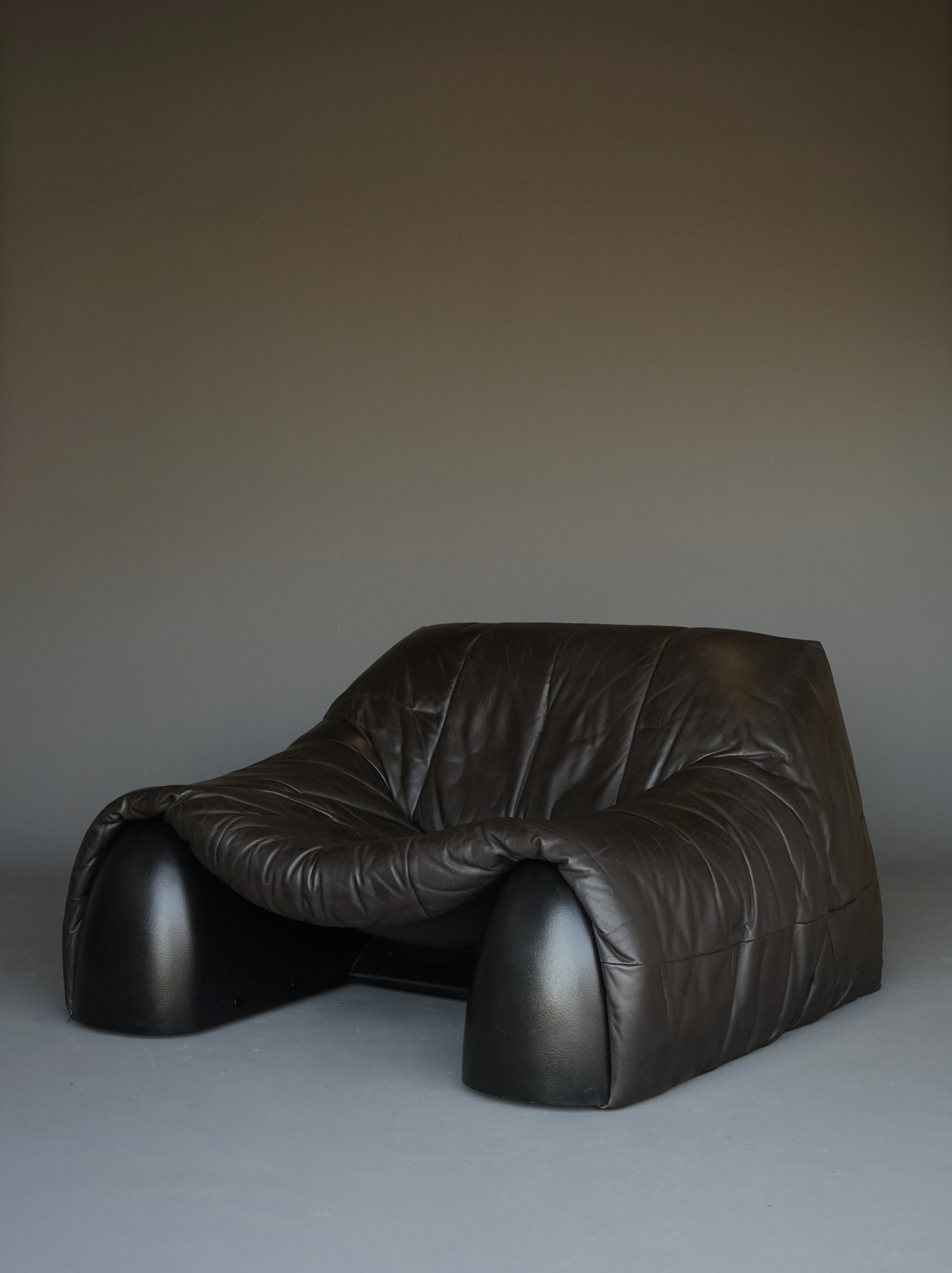 A rare lounge chair designed by French designer Annie Hieronimus and executed by Cinna. This model of lounge chair very hard to find anywhere – it was only produced for three years between 1983 and 1986. Its remarkable look comes from the combination of soft folded leather that seems to bridge two large ballistic looking feet.