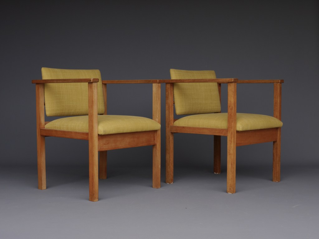 Important pair of armchairs designed and manufactured during Jan den Drijver’s formative years in The Hague when he established ‘Woningrichting De Stijl’, a showroom and workshop which lasted for only three years between 1933-36. (One chair retains its original paper label).