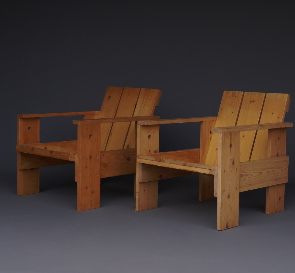 The design of this particular model (without arms) inspired Rietveld in the design of his well known ‘Military Chair’ in 1923. It is a design that is well documented in the monograph on Klaarhamer written by author/historians Marijke Kuper & Monique Teunissen*. This book details a letter (with a sketch of the chair) by Gerrit Rietveld to the architect J.J.P Oud.
