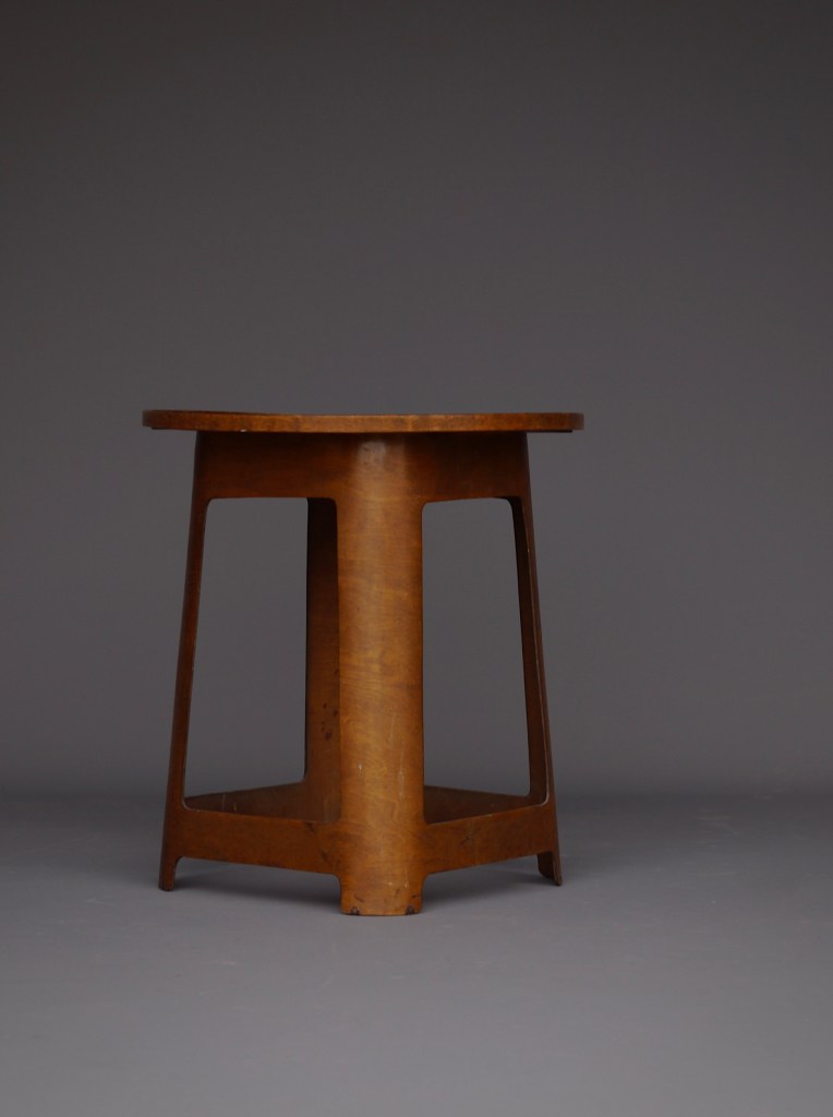 Although the designer of the stool remains anonymous, in 2004 the art historian Alastair Grieve described a modification of the original Luterma stool (of which this stool is one) when he wrote that the original design was subsequently re-designed by the architect and founder of the Bauhaus Walter Gropius (hired as a consultant to Isokon). The very slight alterations Gropius made was to include sharper curves to the cut-out squares of the stool. Gropius’s drawings for the redesign can reportedly be found in the collection of the V&A Museum, London.