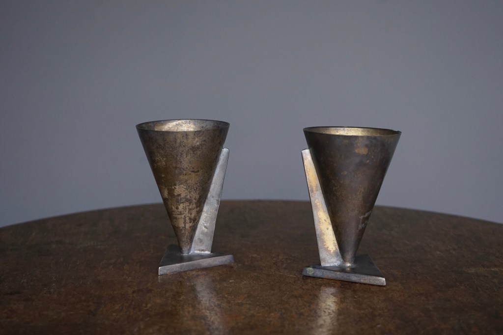 Two rare sculptural vases attributed to the German metal work factory WMF. The design was inspired by Cubist or Futurist art of the period when they were produced. These vases have an elongated elegance and balanced sculptural form that works from every side. Original condition.