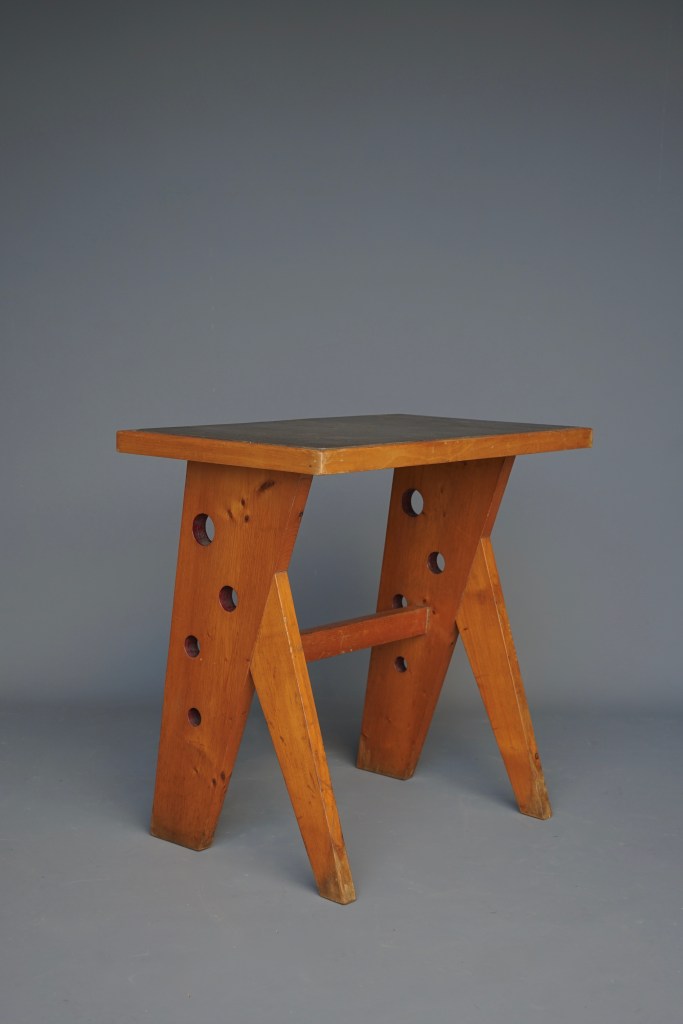 This design stands out for its curved lines and the three-position system that allows the seat and backrest to be tilted. Nicely executed out of pear wood and woven cane seat and back.